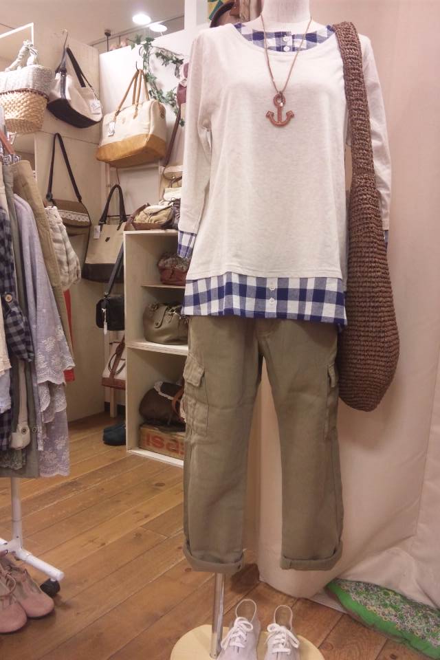 こんにちは(^^) すっきりとした、カジュアルコーディネート。 とても、人気だった重ね着風カットソーが 今年も入荷したので、ご紹介します☆ カットソー 2415yen パンツ 3675yen カバン 4095yen イカリのレザーネックレス 1575yen 無地のTシャツにチェックのブラウスを 重ねたようなデザイン。 1枚で着られるのが嬉しいですよね(^^)! 綿麻で優しい風合いのパンツを合わせました。 楽ちん、でもオシャレな着こなしです。 りっち