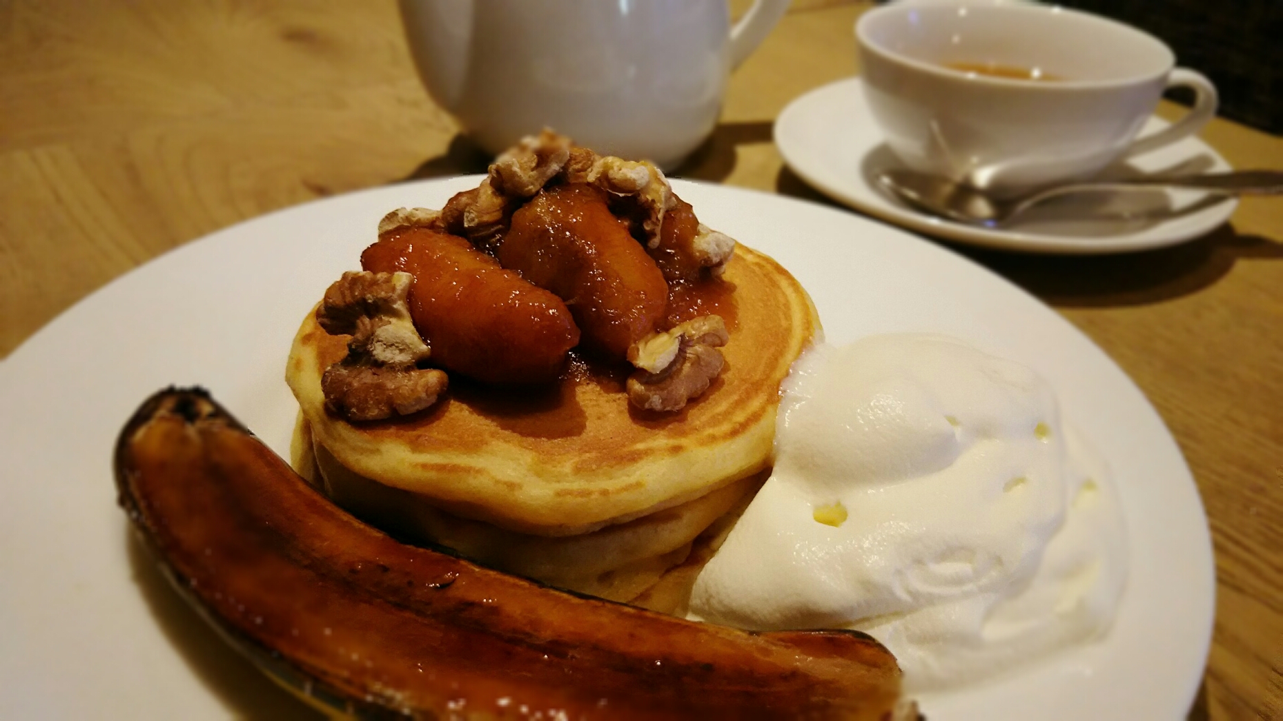 当店のパンケーキだけでもがっつりお腹に残るボリューム+バナナキャラメル