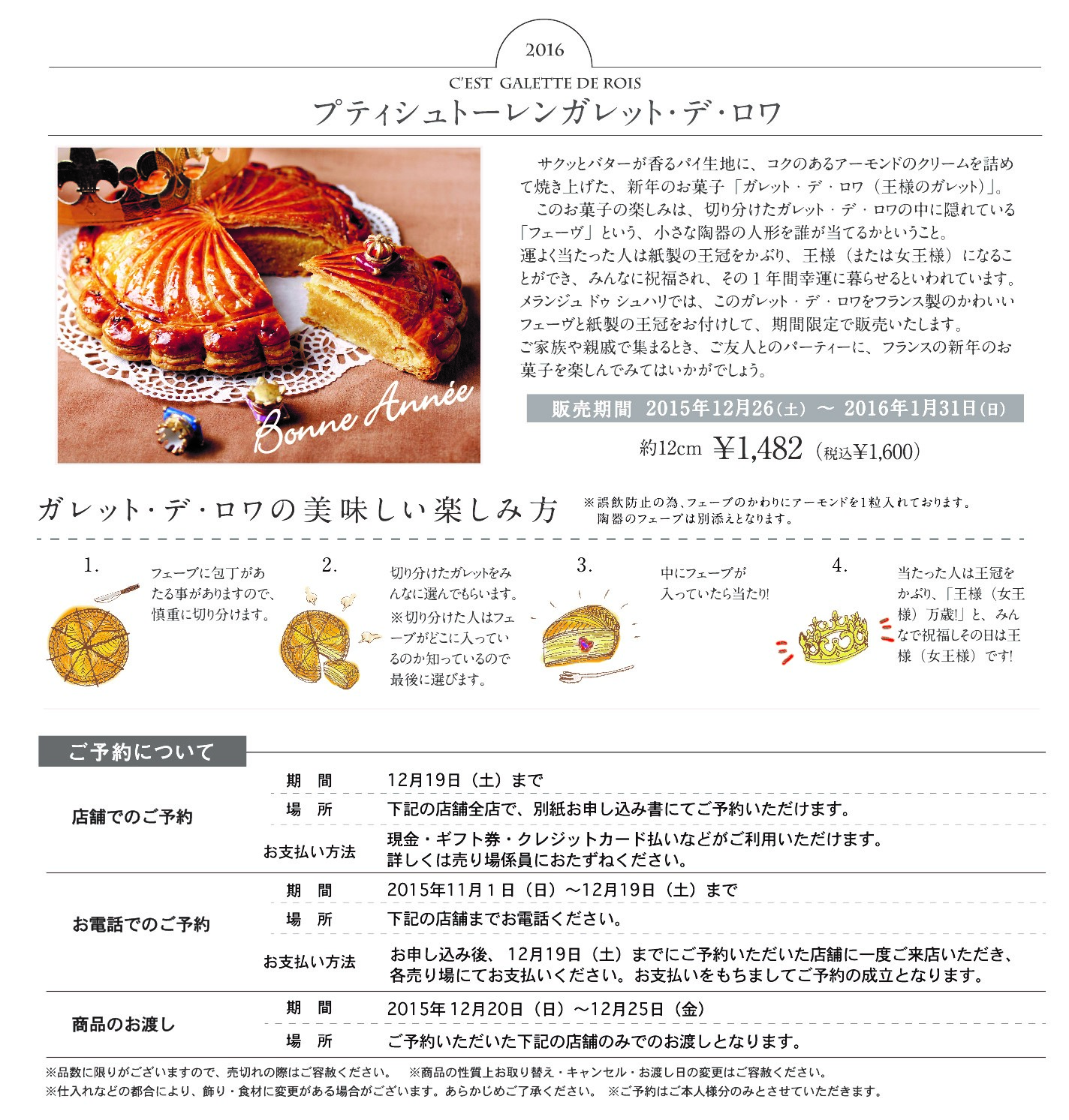ガレット・デ・ロワの販売期間は2015年12月26日(土)~2016年1月31日(日)となります。